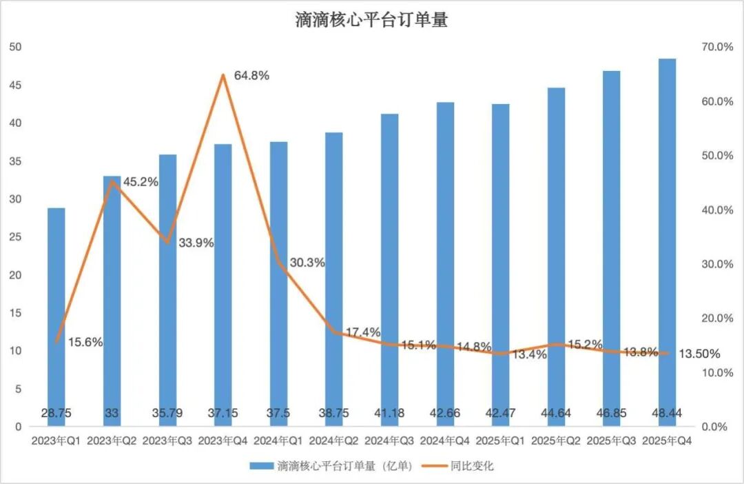 财报显示,滴滴的主营业务依然保持比较稳健的增长。2025年第四季度,滴滴核心平台(中国出行与国际业务)订单量同比增长13.5%至48.44亿单,单日订单峰值超6500万单。2025年全年,核心平台订单量达到182.4亿单,同比增长14%。