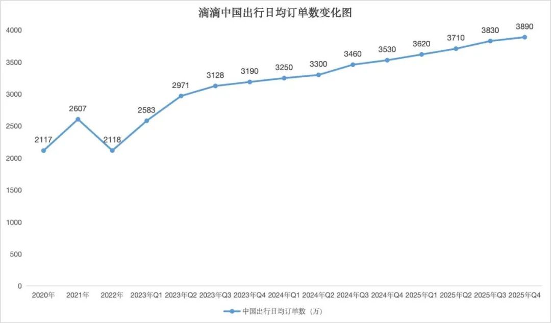 根据财报,2025年第四季度,滴滴中国出行订单量同比增长10.1%至35.78亿单,日均订单量攀升至3890万单;全年订单量同比增长10.8%至137.35亿单。这也是自2023年以来,中国出行连续12个季度订单量保持双位数增长。