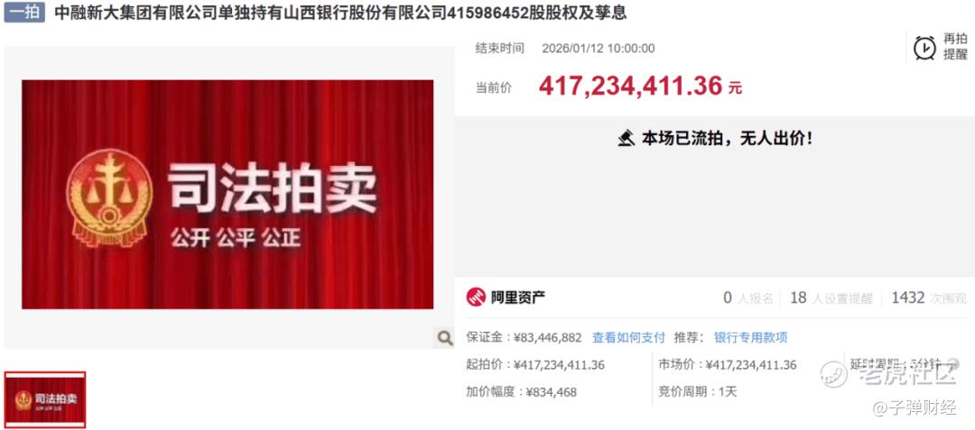 2026年1月初,山西银行发生了一笔超过4亿元的股权拍卖事件,却最终流拍。