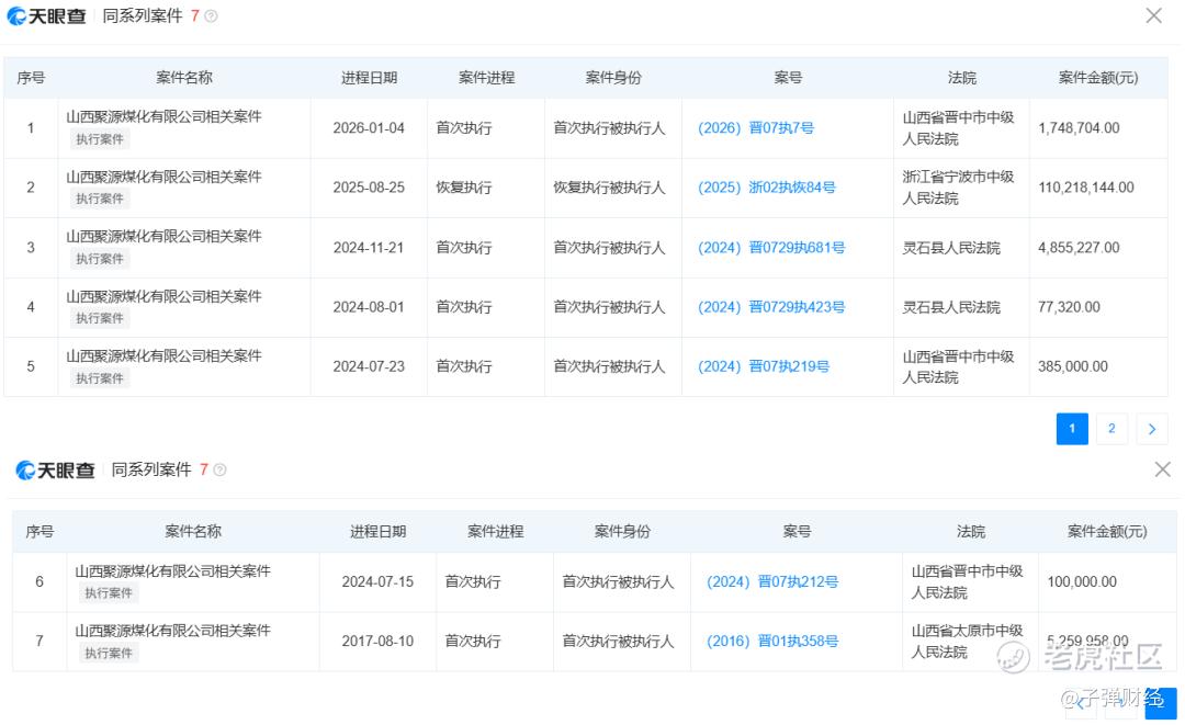 天眼查显示,山西聚源煤化在2017年至2026年初期间,因不同纠纷案件而多次被列为被执行人。