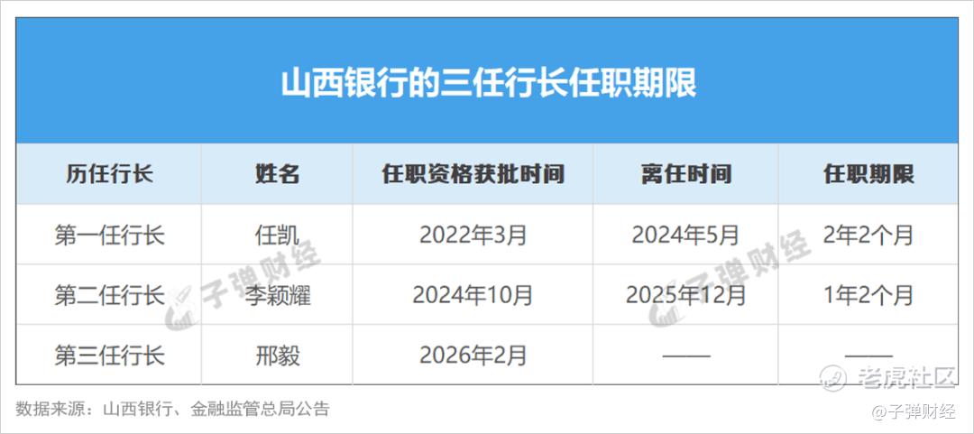此前在2025年12月初,山西银行公告称李颖耀另有任用,不再担任本行行长;同时表示聘任邢毅作为该行行长,在任职资格获批前,由他代为履行行长职责。