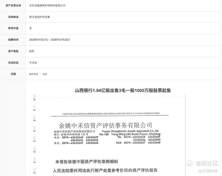 2026年1月21日,山西聚源煤化持有的山西银行1.94亿股股权再次现身拍卖平台,尚处于提交意向阶段。拍卖信息显示“一股3毛”,由此测算拍卖金额仅7769万元,资产处置主体是合生创盈融资担保股份有限公司。