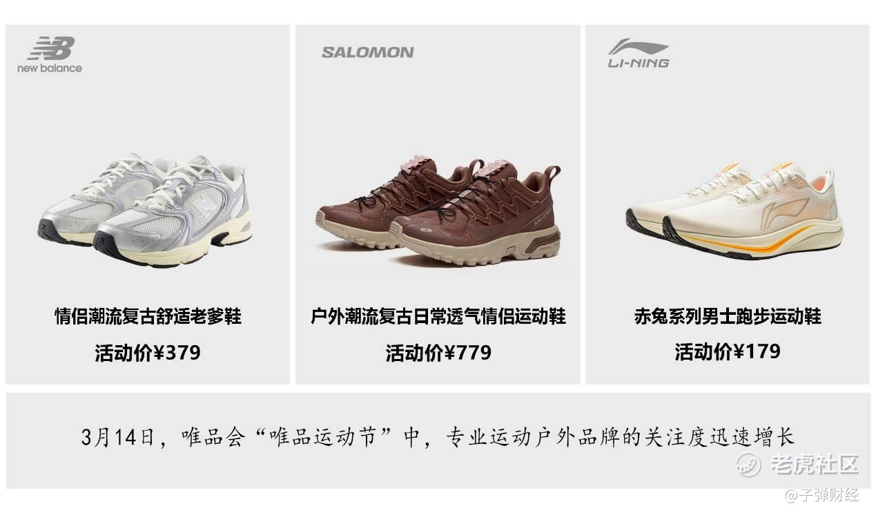 事实上,电商平台与运动品牌也在试图追上此次消费高潮,3月14日早10点,特卖电商平台唯品会的促销活动“唯品运动节”中,萨洛蒙、安踏、李宁、伯希和、凯乐石等多款运动鞋或冲锋衣成为收藏排行榜前列的商品,以萨洛蒙的一款户外潮流复古运动鞋为例,当天售价仅为779元,而李宁的一款赤兔8系列运动鞋,低至179元,“被大量预定,几乎是不会再有的价格”,平台相关负责人介绍。