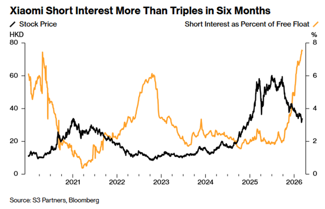 19、由于存储芯片价格飙升持续挤压其低利润率的智能手机业务,且电动汽车部门因市场竞争白热化导致交付量下滑,针对小米集团的做空押注显著增加。数据显示,其流通股的卖空比例已从2025年9月的约2%攀升至7.5%,同期股价自高点回落44%,为做空方带来18亿美元的账面利润。