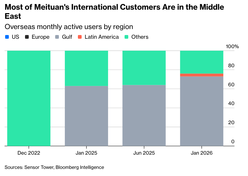17、为缓解国内价格战及阿里巴巴蚕食市场份额所带来的盈利压力,美团正加速海外扩张,但其战略正面临多重挑战。在拉丁美洲市场,因巴西市场领导者iFood的餐厅独家协议限制,美团的扩张计划受阻并已裁员。与此同时,其最成功的海外市场中东地区,虽已贡献超过三分之二的海外商品交易总额(GMV),并在沙特阿拉伯市场占据第二,但当前伊朗的军事冲突给该区域的运营带来了地缘政治风险。