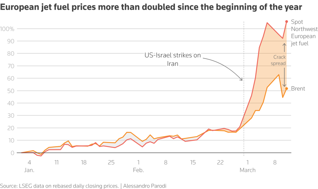 3、自2026年3月初美以对伊朗采取军事行动后,航空燃油价格已经翻了一番,远远超过了原油价格三分之一的涨幅。这一差异导致两者间的价差急剧扩大,给全球航空公司的成本控制带来巨大压力。