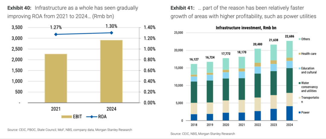 7、中国整体基建项目的现金流生成能力已逐步改善,其总资产回报率(ROA)从2021年的1.27%微升至2024年的1.30%,同期息税前利润(EBIT)则从2.2万亿元增至2.9万亿元,可覆盖约70%的年度利息支出。此轮改善由投资结构向高利润领域倾斜所驱动,其中电力设施投资在2021至2024年间复合年增长率高达22%,其资产回报率估计超过3.7%。