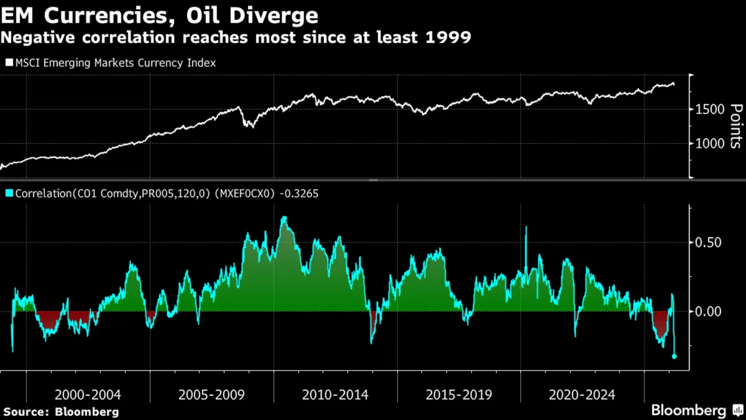 2、中东地缘政治冲突引发的能源供应冲击,正推动布伦特原油期货以2020年以来最快速度飙升,而MSCI新兴市场货币指数则迈向2024年底以来最严重月度跌幅,两者120日移动平均相关系数已降至-0.34,为1999年有数据以来最低水平。此轮油价上涨由供应中断而非全球需求增长驱动,使原油价格转变为避险交易的催化剂,促使资本从发展中国家回流美国资产,逆转了过去两者间的正相关性。