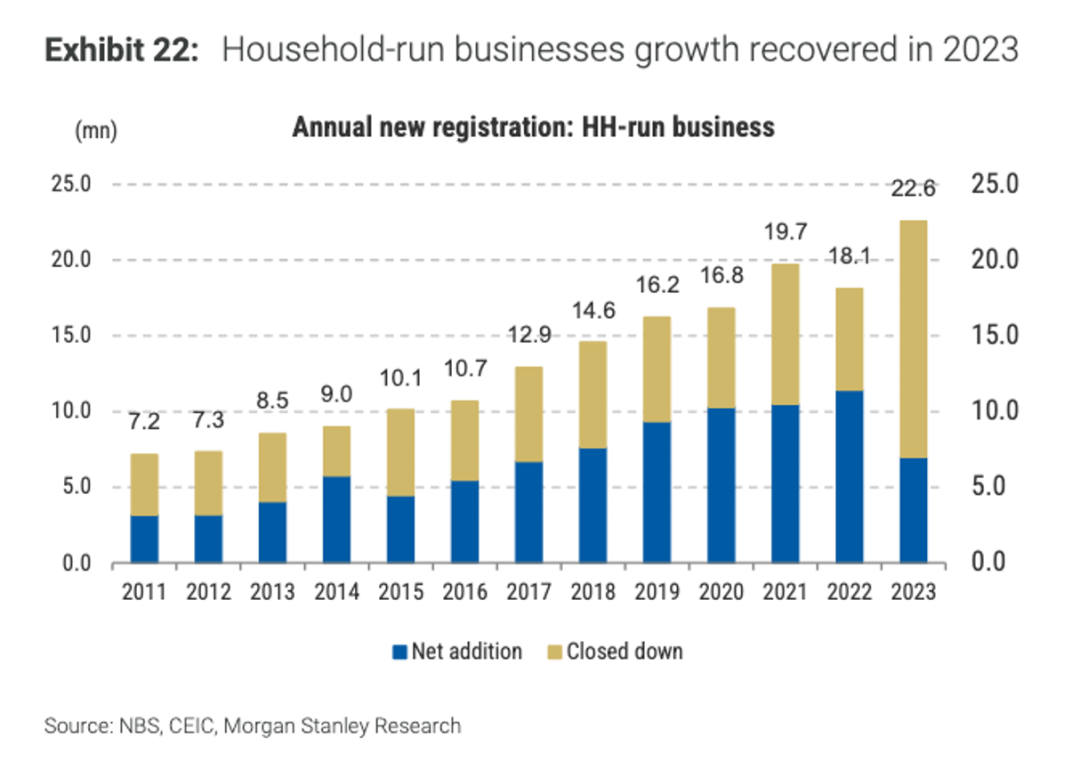 5、中国超过7亿的就业人口中仅有6000万至7000万人缴纳个人所得税,其中一部分差异源于大量劳动人口通过纳税极少或免税的小微企业获取收入。这些个体经营企业构成了中国就业结构的重要基础,其年度新注册数量在经历2022年的短暂回落后,于2023年恢复增长,达到了2260万家。
