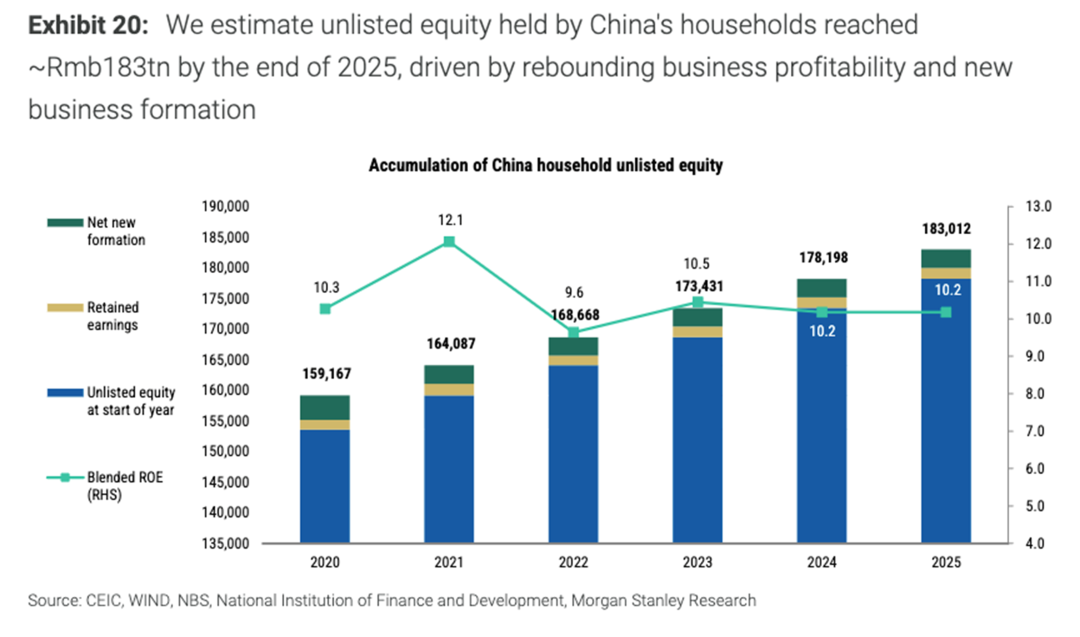 11、截至2025年底,中国家庭持有的未上市股权总额估计将达到约183万亿元人民币,其增长动力源于企业盈利能力的反弹,以及数量众多的中小型企业不断成立。这部分股权分布在超过1亿个商业实体中,根据国家金融与发展实验室的研究,这些实体所有权为中国家庭创造的收入远超其持有的金融资产和房产。