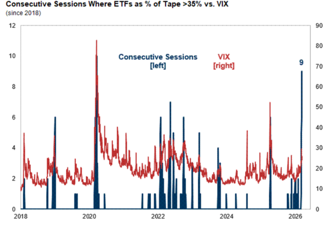20、高盛提供了一个令人惊讶的分散度统计数据:周四交易所名义交易量中,超过40%来自ETF。过去九个交易日中,ETF交易额占全市场成交的比例均超过35%,这是有记录以来第二长的连续记录。值得注意的是,尽管ETF交易活动异常活跃,市场波动率(Vol)却持续处于低位——上一次出现连续9个交易日如此高水平的ETF交易占比时,VIX指数曾飙升至70以上。