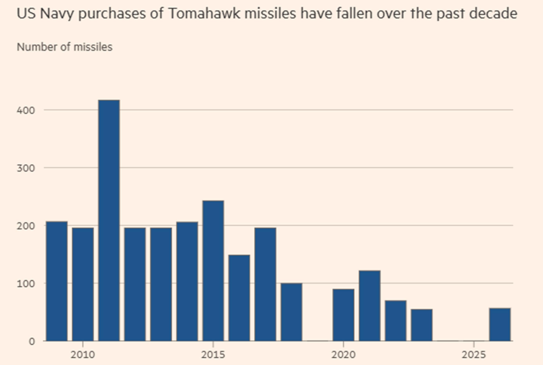 19、自与伊朗的战争爆发以来,美国关键弹药库存已消耗了数年储量,其中由RTX公司生产的战斧巡航导弹消耗尤为严重。根据战略与国际研究中心的数据,战争开始后的100小时内就发射了168枚,而过去五年美军的总采购量仅为322枚。为补充军备,五角大楼预计将向国会寻求高达500亿美元的额外军事拨款,但同时需应对其单价360万美元的导弹与伊朗仅约3万美元的无人机之间存在的巨大成本不对称问题。