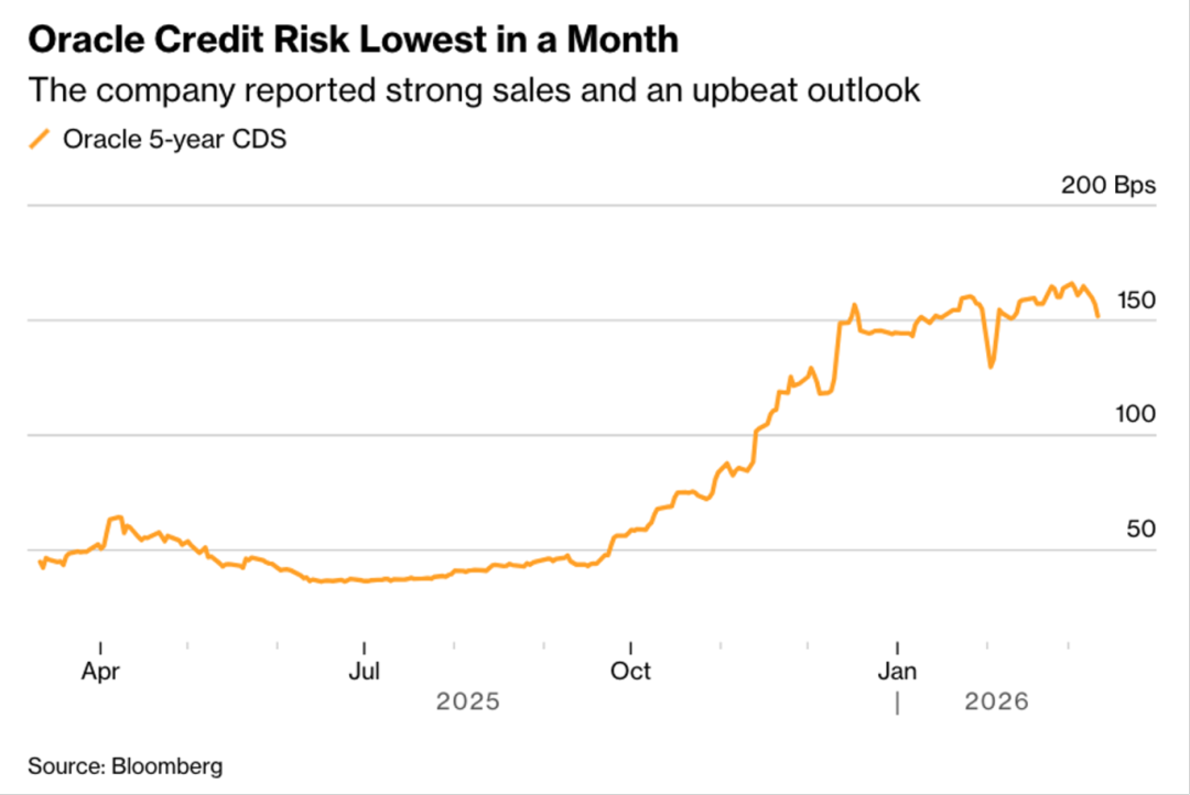 15、甲骨文公司强劲的销售业绩和乐观的AI计算需求展望,缓解了市场对其高额资本支出的担忧,其五年期信用违约互换(CDS)成本因此下降0.054个百分点至1.52个百分点,达到一个月来的最低点。尽管该公司上一季度资本支出高达186亿美元,远超140亿美元的预期,但其维持了500亿美元的财年预测,并通过近期完成的250亿美元债券发行及计划中的250亿美元股权融资来稳定资产负债表。不过,当前甲骨文的债券和CDS利差仍显著高于同行,显示投资者的疑虑并未完全消除。