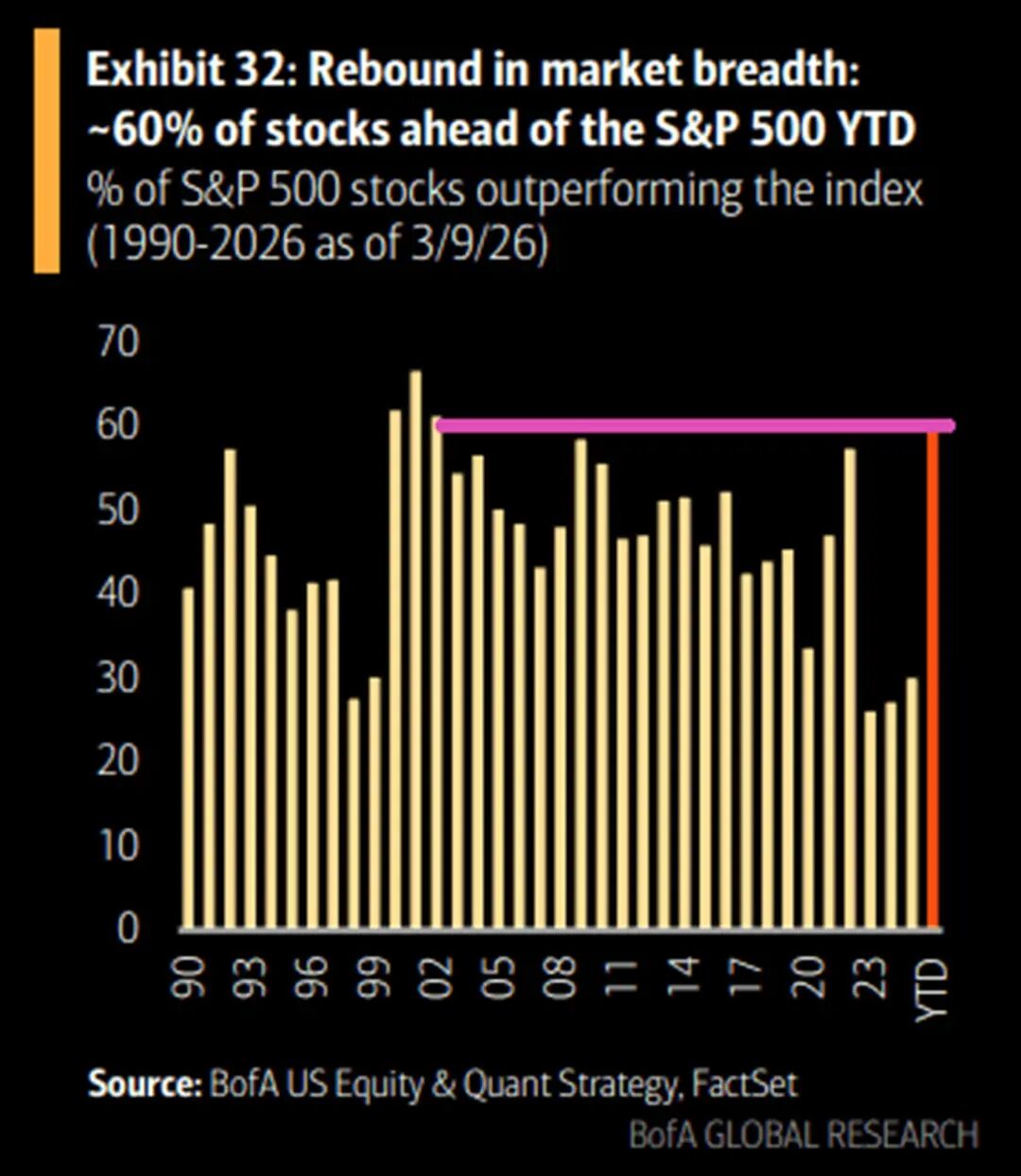 12、年初至今约60%的标普500指数成分股表现优于指数本身,这一比例已达到2002年以来的最高水平。