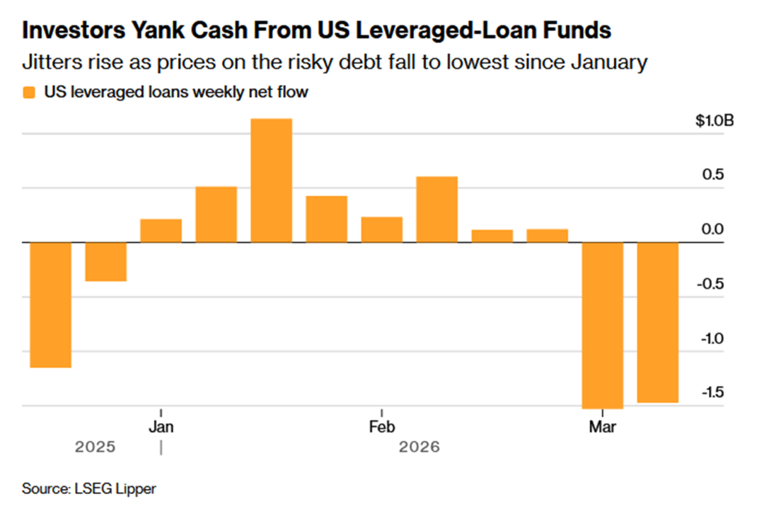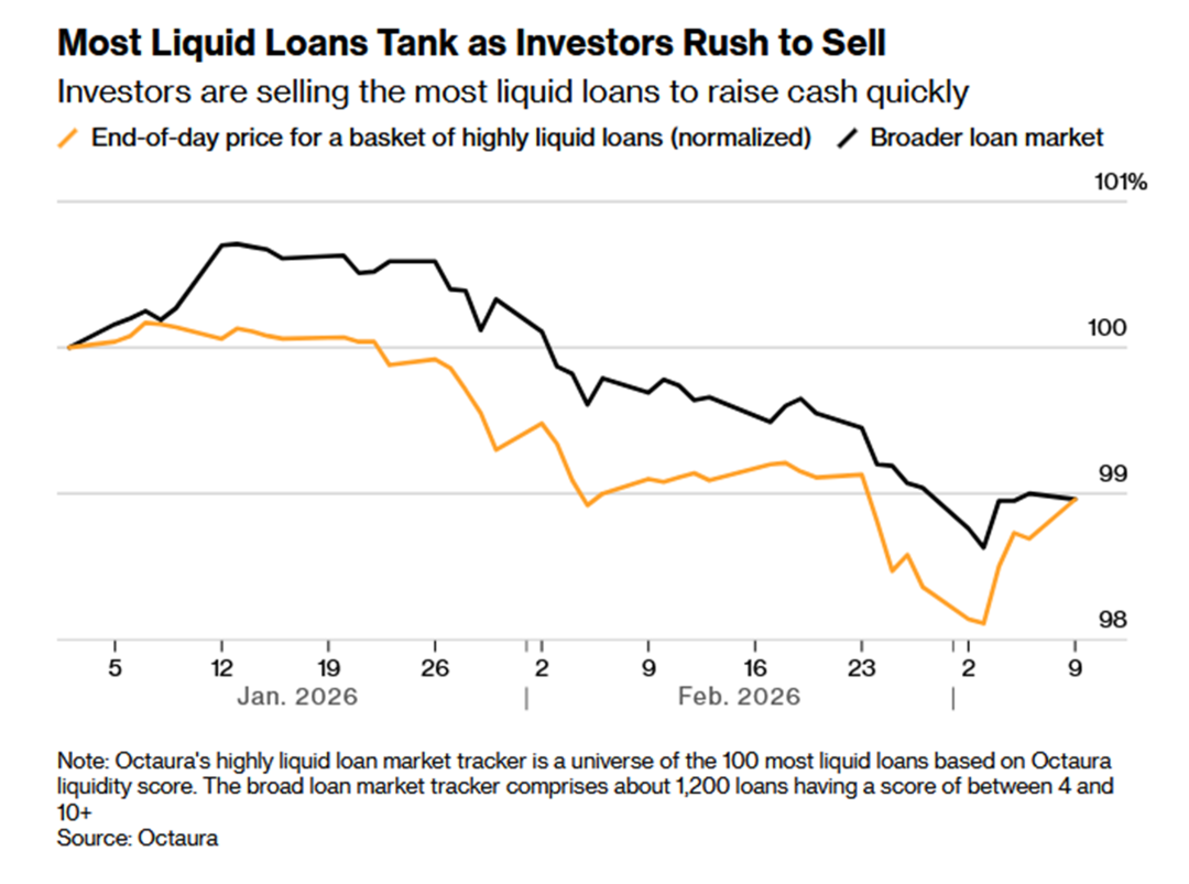 14、根据Octaura的数据,由100只最具流动性的杠杆贷款组成的价格指数自2026年初以来已下跌1.04美分,超过了由约1200只贷款构成的更广泛市场指数1.01美分的跌幅。这种价格表现的分化在2月最后一周尤为明显,当时高流动性贷款价格下跌0.77美分,而大盘指数仅下跌0.4美分。此现象并非完全源于对特定借款人信用风险的担忧,而是在于当基金需要为应对赎回而筹集现金时,管理者倾向于优先出售规模更大、质量相对更高且最容易变现的资产。