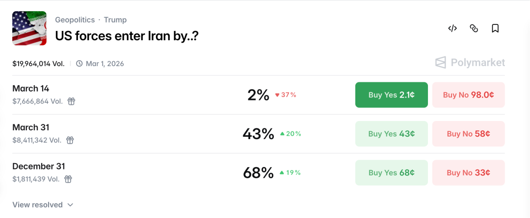 美国月内派出地面部队入侵伊朗的预测则超过40%。