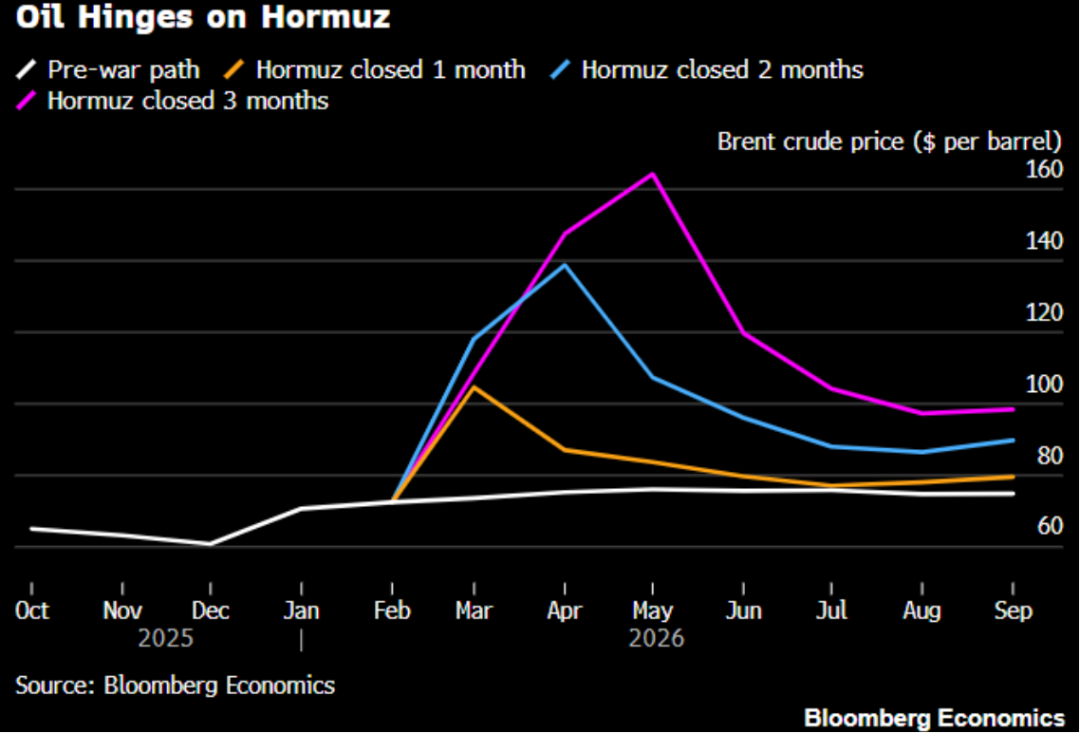 4、彭博社经济团队估算:若霍尔木兹海峡关闭3个月,布伦特原油价格将飙升至每桶164美元。