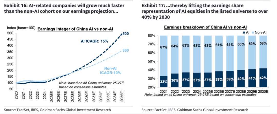 14、基于盈利增长路径预测,中国人工智能相关公司的前景显著优于非人工智能同业,前者的盈利复合年均增长率(fCAGR)预计为15%,而后者仅为10%。这一差异将使AI公司在未来十年的累计盈利增长幅度领先非AI公司140个百分点。受此驱动,AI企业在整体股市盈利中的占比将从目前的37%系统性地提升,预计到2030年达到42%,至2035年进一步增至47%。