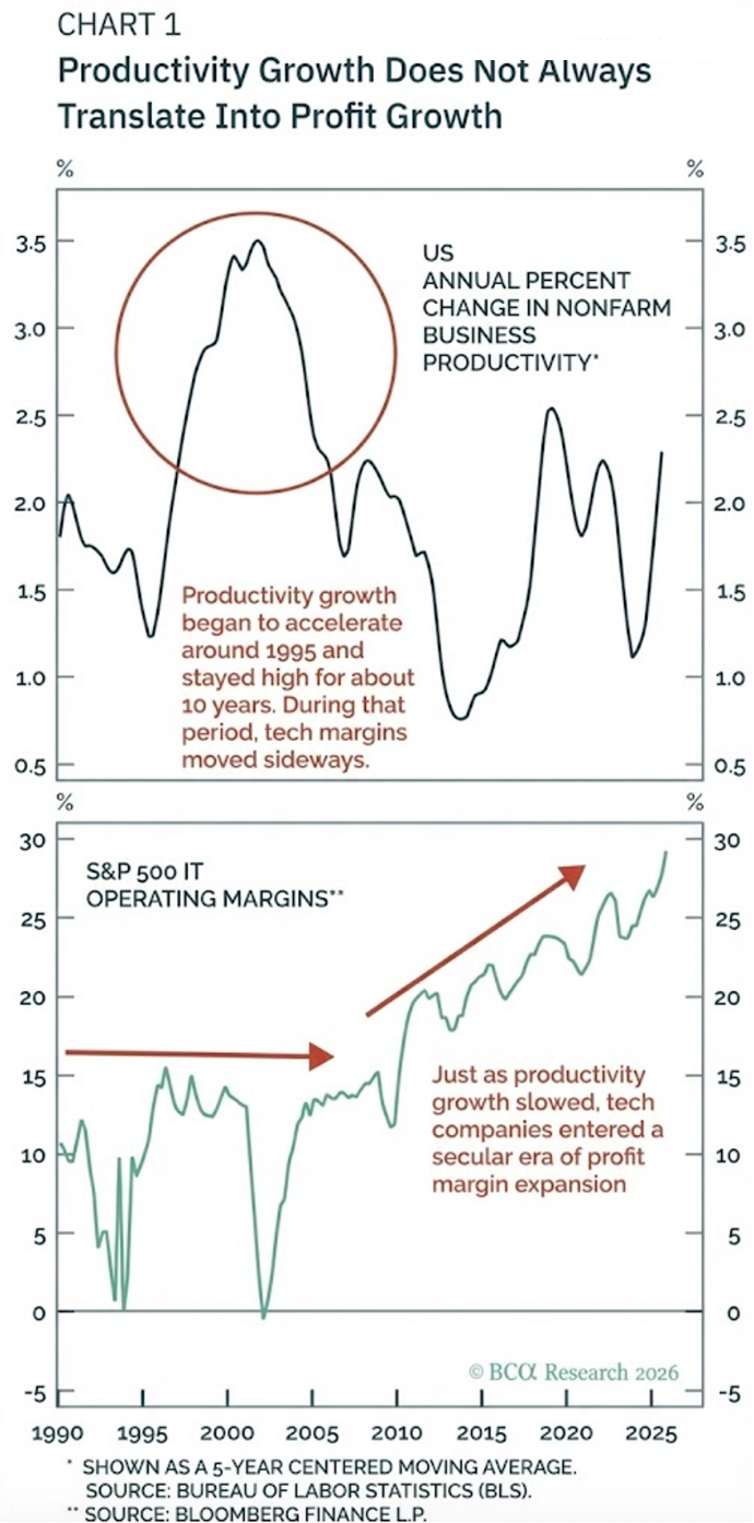 6、1995至2005年间,美国非农生产率经历了高速增长,但同期标普500信息技术板块的营业利润率基本持平。当生产率增速放缓后,科技公司的利润率反而进入了持续的扩张阶段。这可能是因为行业的整合带来了市场集中度的提升,胜出企业利用其支配地位获得了定价权。