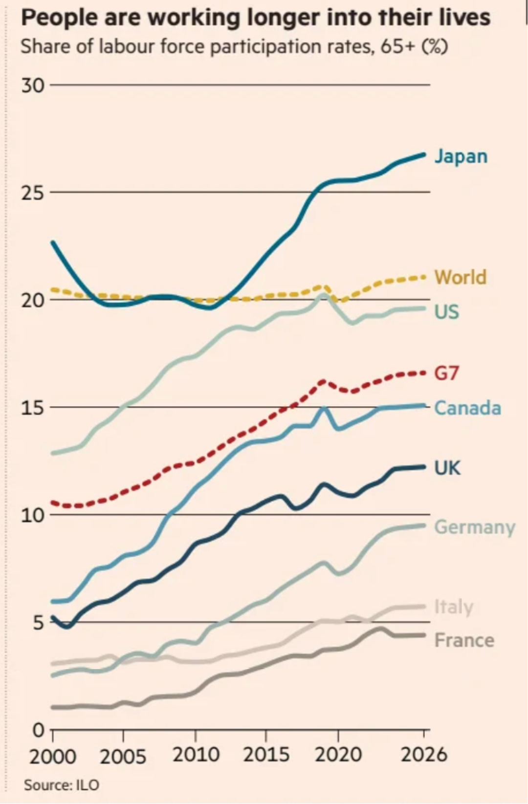 3、在延长退休年龄、财务需求及社会观念转变等多重因素驱动下,全球范围内65岁以上人口的劳动参与率呈现持续上升趋势,其中日本尤为突出,该年龄段的在职人口比例已从本世纪初的约20%攀升至2026年的超过25%。这一现象标志着20世纪末劳动者平均退休年龄持续下降趋势的逆转,根据对OECD数据的分析,过去二十年间,富裕经济体中50岁以上人群的就业岗位增量是50岁以下人群的两倍以上。目前,超过半数的OECD成员国已通过立法来提高法定退休年龄,以适应人均健康寿命延长的状况并缓解养老金体系的压力。