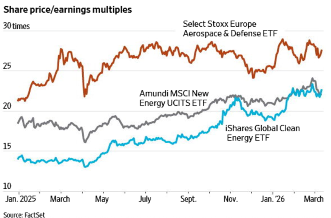 4、在欧洲防务类股票估值因地缘政治风险升至27.6倍市盈率后,市场开始关注同样具有战略重要性的欧洲能源基础设施。欧洲近60%的能源依赖进口,尤其易受液化天然气现货价格波动影响,其工业用气成本曾是美国的四倍以上。为应对此结构性弱点及保护本土产业链,欧盟已提议“欧盟制造”要求以限制中国设备进口。在此背景下,iShares全球清洁能源ETF与东方汇理新能源ETF的市盈率已从2025年低点回升至约22倍,但相较于防务板块仍有差距,且市场尚未完全计入人工智能数据中心带来的新增电力需求。