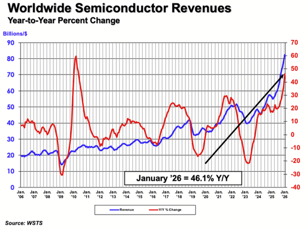 2、在人工智能加速器与高性能芯片需求爆发及全球科技巨头加大AI数据中心投入的推动下,2026年1月全球半导体行业销售额达825.4亿美元,创下月度新高,同比增长46.1%。美国半导体产业协会(SIA)预计,随着AI技术广泛渗透,2026年半导体营收有望首次突破万亿美元大关。