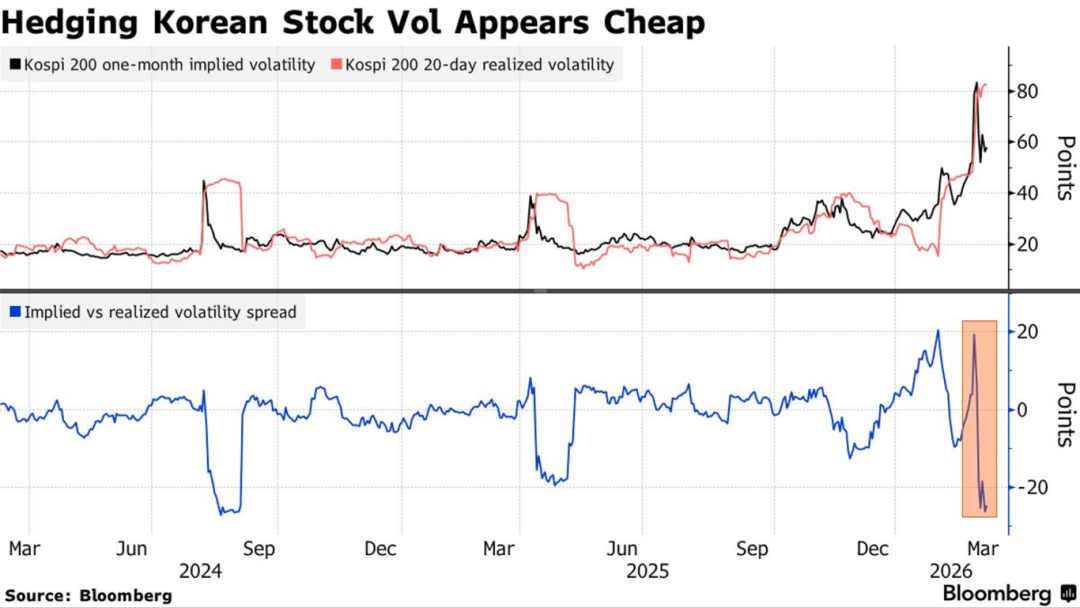 6、韩国Kospi 200指数的20日历史波动率升至2008年金融危机以来最高点,但期权市场所反映的隐含波动率虽同步上涨但升幅不及前者。此种分化导致两者价差降至2024年8月以来的最低水平,跌破负20点。这一价差结构表明,市场交易员普遍押注当前的高波动环境仅为短期现象,并未将此种波动性完全计入定价模型,预期市场将较快回归稳定。