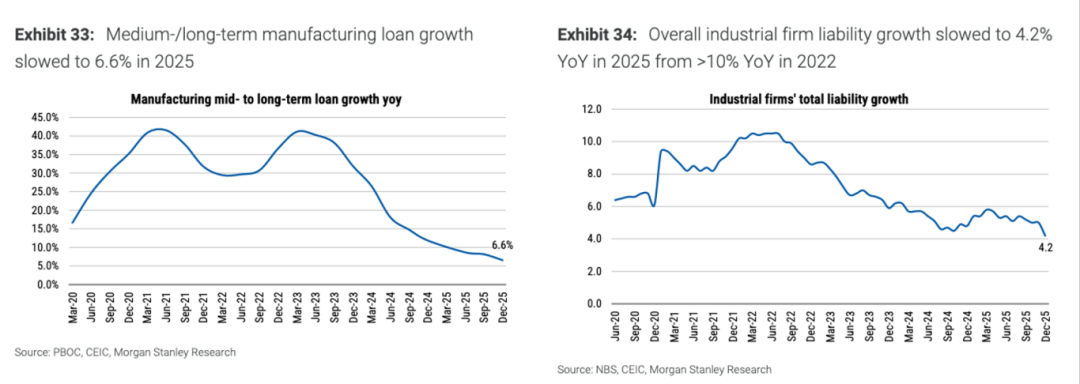 10、中国的工业信贷已从风险扩张模式转向风险消化模式,其标志在于制造业中长期贷款的同比增长率已从2023年中的超过40%大幅放缓至2025年的6.6%,同时工业企业的总负债增长率也自2022年高于10%的水平降至4.2%。与此同时,制造业资本支出增长已降至约4%,该增速低于工业需求增长并与GDP增速基本持平。