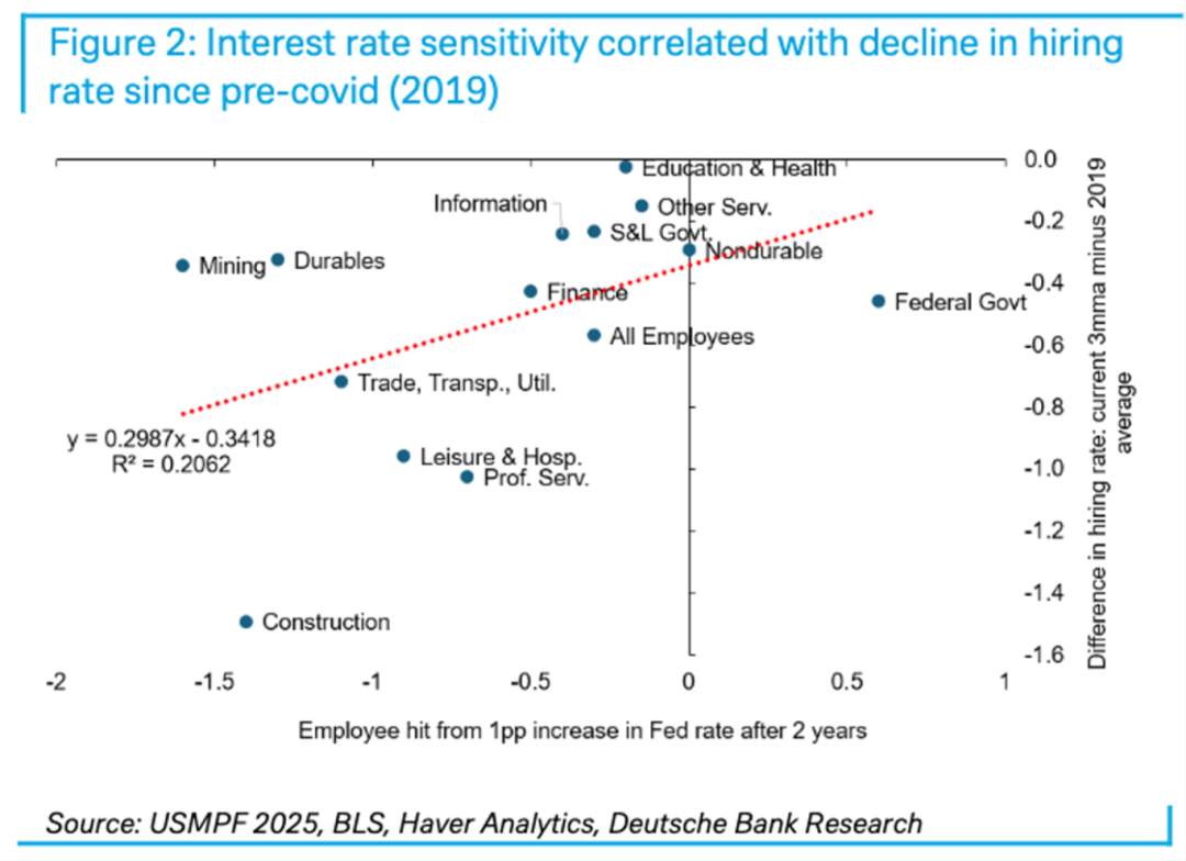 4、美国各行业招聘率自2019年前水平的回落程度,与其对利率的敏感性存在正相关关系。建筑业等对利率高度敏感的行业,招聘放缓幅度显著大于教育与医疗服务等低敏感度行业。