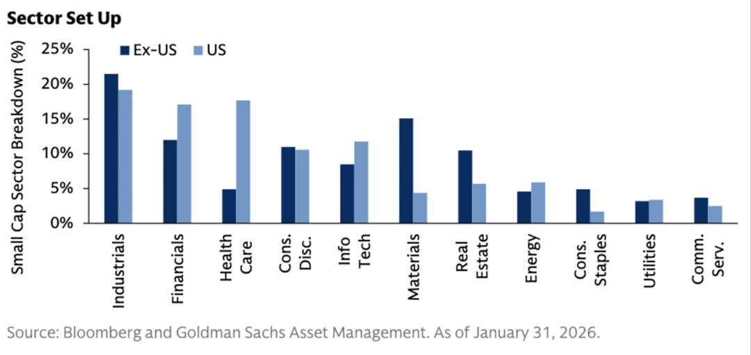 9、美国与非美市场的小盘股在行业结构上存在显著差异,美国小盘股市场中,医疗保健与金融行业合计占比接近35%,而工业股权重约为19%。相比之下,非美小盘股市场则高度集中于工业(占比约21.5%)和材料(占比约15%)两大周期性行业。