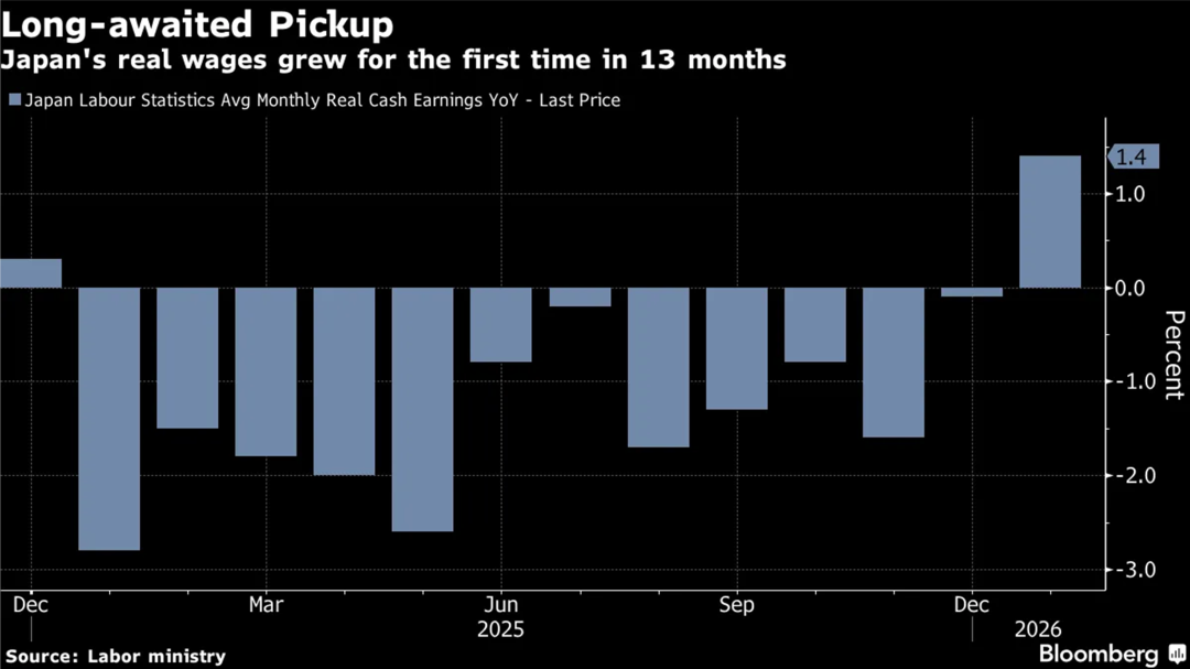 1、日本劳动省数据显示,2026年1月,日本经通胀调整后的实际工资同比增长1.4%,为13个月以来首次录得正增长,并超出市场预期的0.9%。该增长主要得益于政府能源补贴及食品价格稳定带来的通胀放缓。同期,名义工资上涨3%,其中基础工资增幅达到33年来的最高水平。这一变化对寻求建立工资与物价良性循环的日本央行构成支持,为后续政策正常化提供了数据依据。市场正密切关注春季劳资谈判结果,日本劳动组合总连合会已提出5.94%的平均加薪要求。