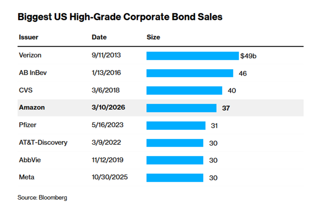 10、根据彭博报道,亚马逊正启动一项大规模跨大西洋企业债发行计划,拟在美元与欧元市场同步募资370亿至420亿美元,此规模将使其成为近年最大的企业债筹资案之一,并接近Verizon在2013年创下的490亿美元历史纪录。具体结构为,美元计价部分规模达250亿至300亿美元,分为最多11个2至50年不等的期限,其中2076年到期的债券初步定价显示其收益率较美国国债高出1.55个百分点。此外,公司将首次发行最高达100亿欧元的欧元计价债券。