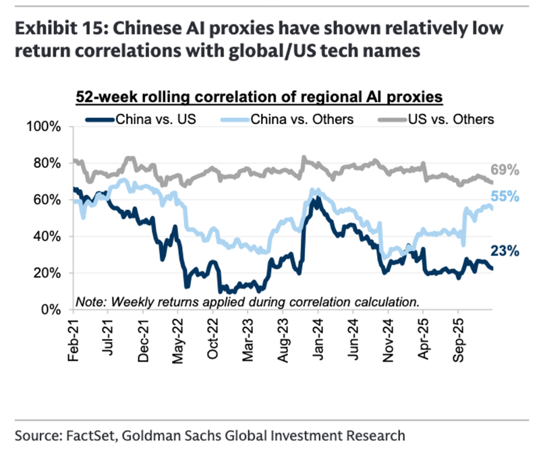 13、中国与美国AI相关股票的相关性仅为23%,显著低于美国与其他全球市场之间69%的相关水平,以及中国与非美国市场之间55%的相关性。这种在整体及行业层面均存在的低贝塔(beta)现象,使中国AI板块呈现为一个由本土特有因素驱动的市场叙事,而非简单跟随美国科技主题的衍生行情。