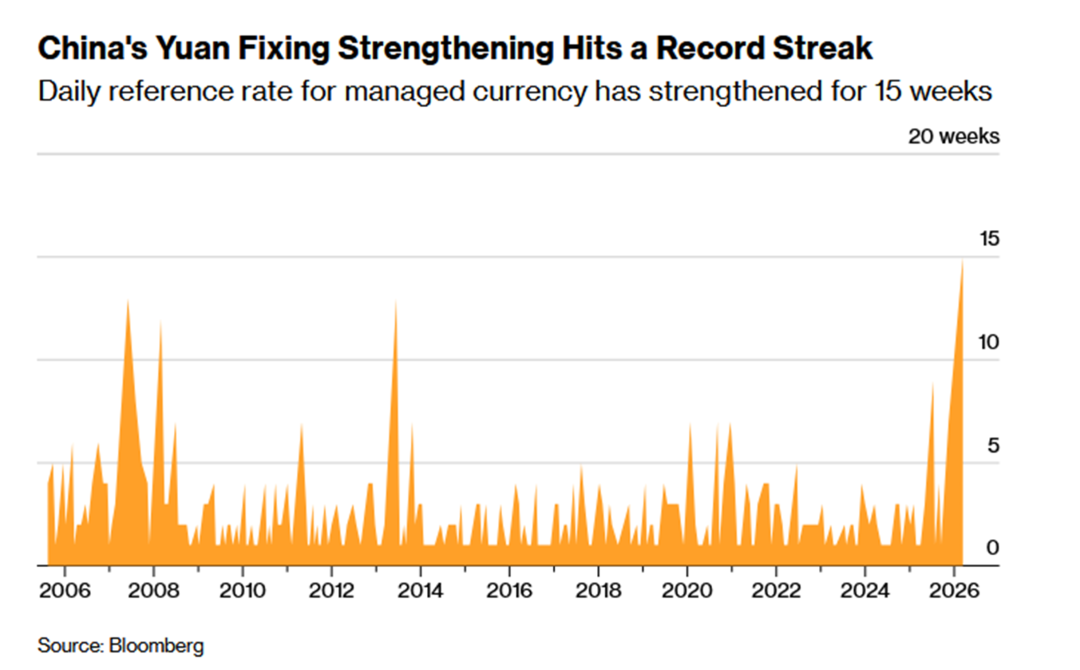 1、中国央行已连续第15周上调人民币中间价,创下历史最长连涨纪录。在此背景下,即便伊朗战争引发的避险需求推动美元连续第二周走强,人民币依然对美元升值。市场分析认为,央行在美元强势周期中仍引导人民币突破6.90关口,显示出在两国巴黎会晤前维持人民币坚挺的政策意图。若中东局势未进一步恶化,预计在月底两国高层可能举行的峰会前,官方将继续维持偏强的中间价设定。