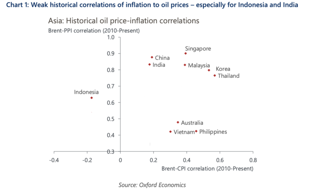 4、亚洲多个经济体通过燃油补贴、价格稳定基金以及国有能源企业等准财政手段,限制了全球油价冲击向国内消费端的直接传导,在缓冲对家庭部门影响的同时,将成本转移至公共部门的资产负债表。这一机制导致了全球油价与部分经济体国内通胀的历史相关性偏弱,其中印度和印度尼西亚尤为突出。数据显示,2010年至今,布伦特原油价格与印度生产者价格指数(PPI)的相关性高达约0.85,但与消费者价格指数(CPI)的相关性仅为约0.2。印度尼西亚的CPI相关性甚至为负值。