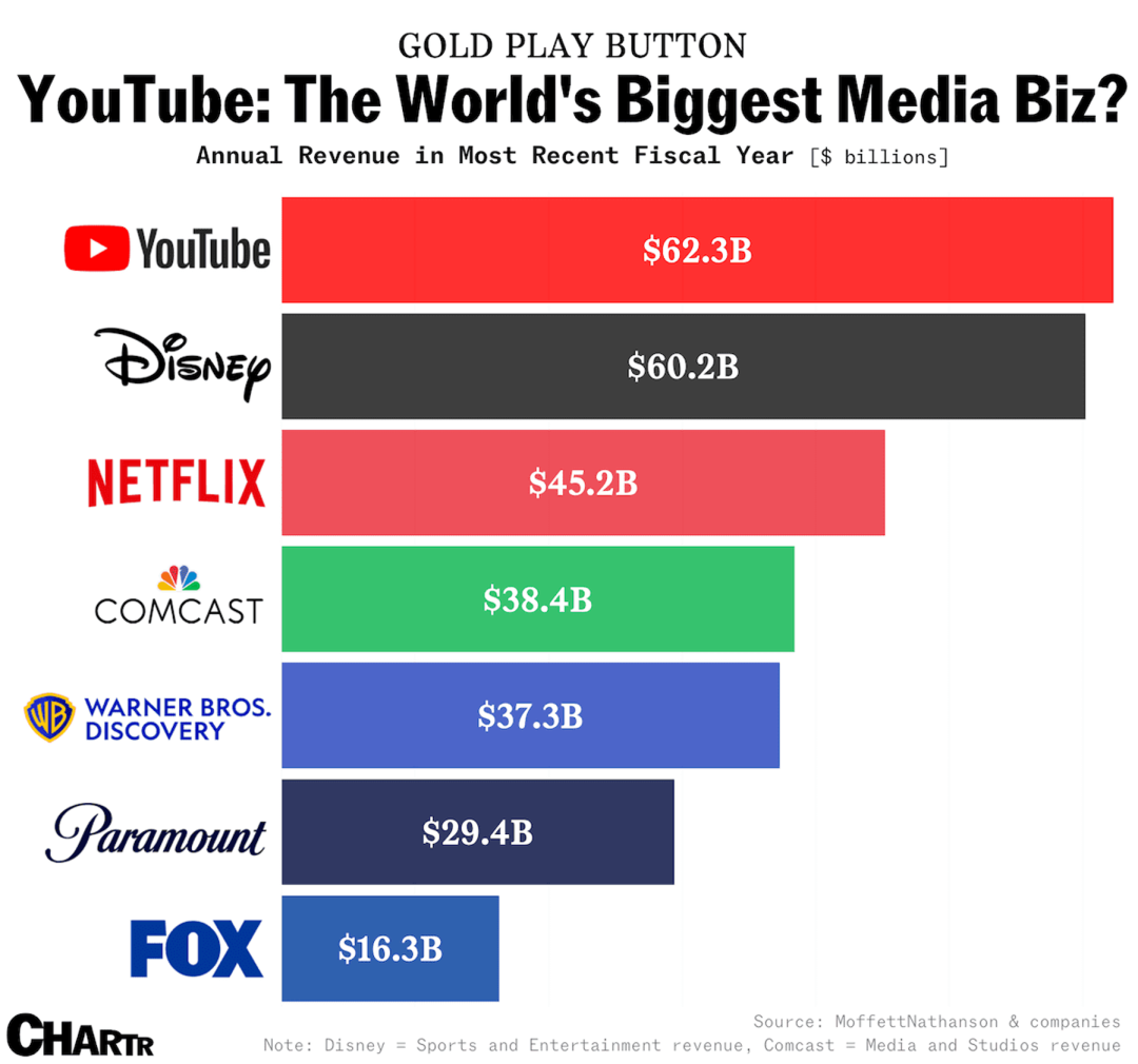 18、根据行业分析机构MoffettNathanson的最新财年收入估算,YouTube在2025年的总收入达到约623亿美元,这一数字已超过华特迪士尼公司由电影、Disney+、Hulu及ESPN等业务构成的媒体部门所录得的602亿美元。尽管收入规模领先,但YouTube需与内容创作者分享高达55%的广告收入,Alphabet的数据显示,截至2025年9月的四年内,公司通过各类收入分成计划向创作者支付的总金额已达1000亿美元。
