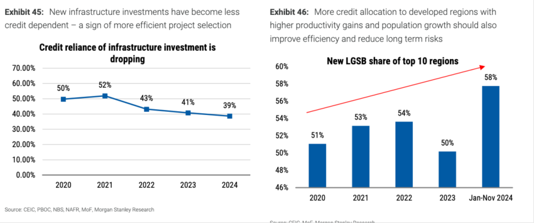 6、中国正在通过新的基础设施项目筛选机制提升信贷配置效率,具体措施包括收紧对地方政府融资平台和低质专项债项目的管控,将融资渠道转向地方政府债券,同时引导信贷资源流向电力能源等现金流更佳的领域,以及生产率和人口增长潜力更大的地区。该机制已降低基建投资对信贷的依赖,新增基建信贷占新增固定资产投资的比例从2021年的52%降至2024年的39%,且新增地方政府专项债愈发集中于头部经济区域,其前十大区域占比至2024年底已升至58%。