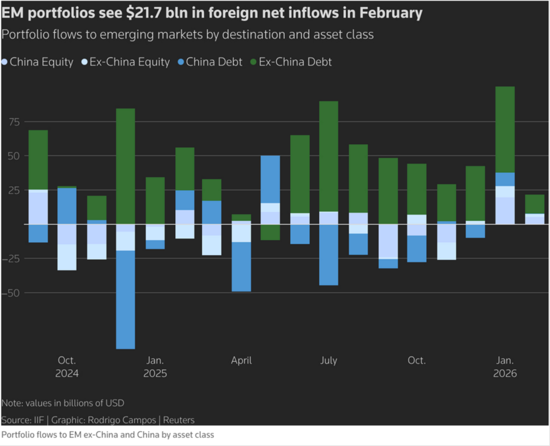 1、2月,全球新兴市场投资组合净流入降至217亿美元,较1月创纪录的1005亿美元显著放缓。其中,新兴市场债券吸引143亿美元,股票流入从1月的280亿美元降至74亿美元。