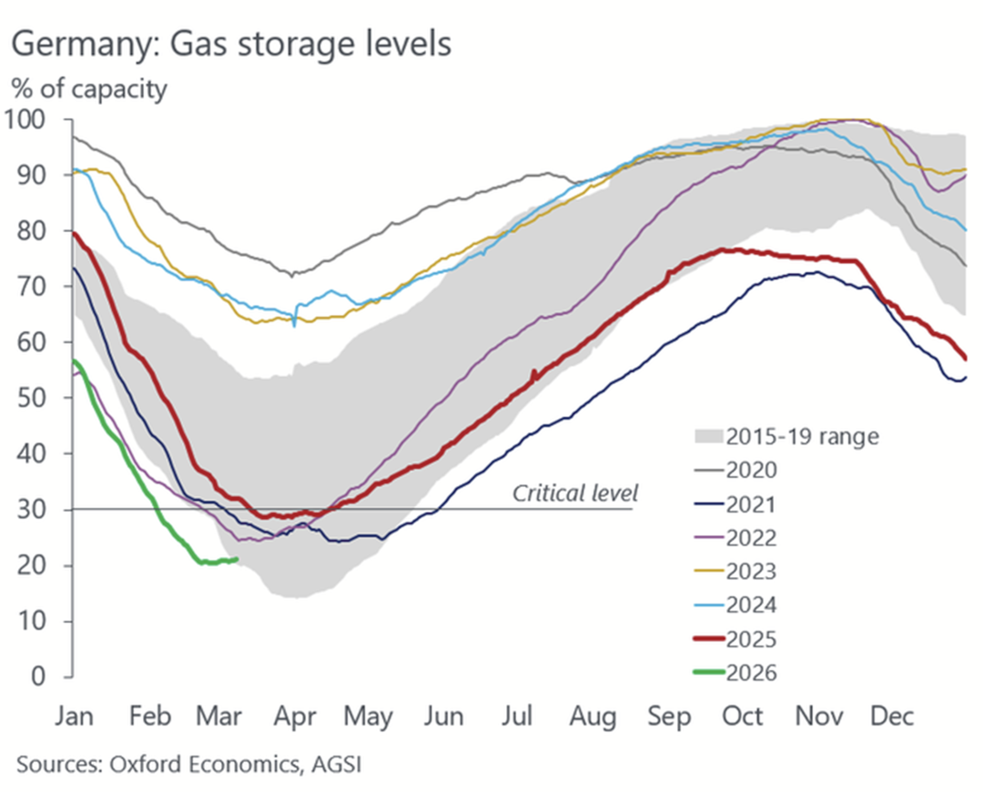 2、德国天然气储量已降至多年来同期最低点,并降至30%的关键水平以下。虽然供暖季临近尾声,但为确保下一个冬季的供应,欧洲必须从极低的库存水平开始大规模补充储备。在天然气市场本已紧张的背景下,这种迫切的补库需求或将加剧全球液化天然气市场的竞争。