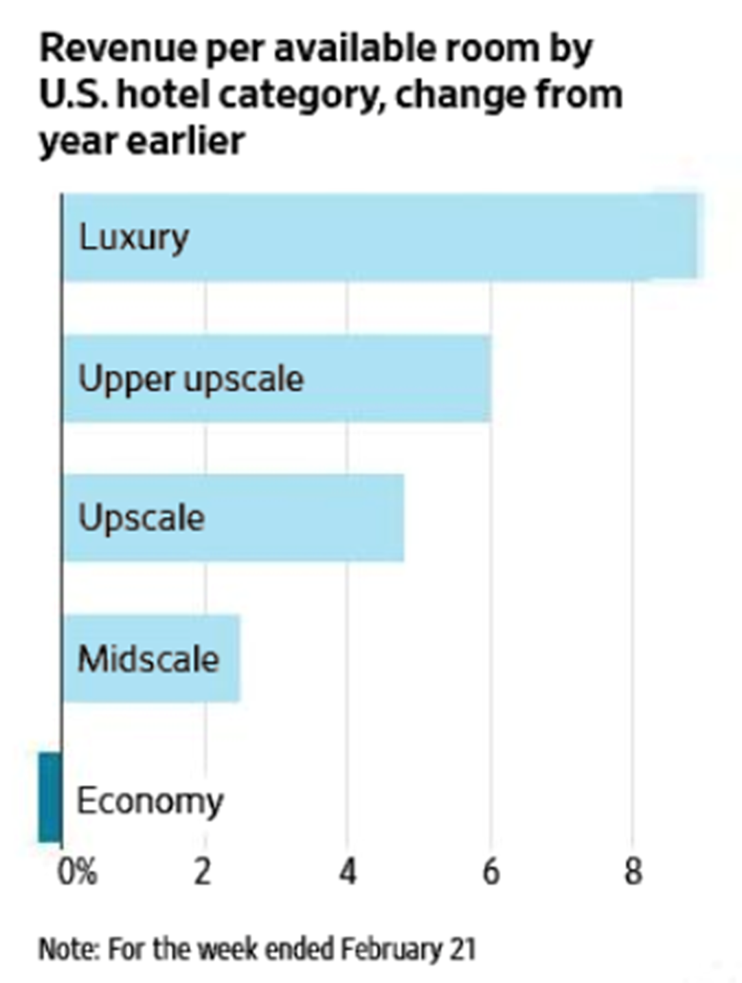 5、美国酒店业经营数据显示出经济增长动能正日益集中于特定领域,根据STR在2月21日当周的数据,日均房价近500美元的豪华酒店,其每间可用客房收入(RevPAR)同比增长了9%,而这一增幅随酒店档次逐级递减,至日均房价约67美元的经济型酒店时则转为负增长。此现象反映出休闲旅游消费主要由拥有大量股票投资组合的富裕阶层所支撑。