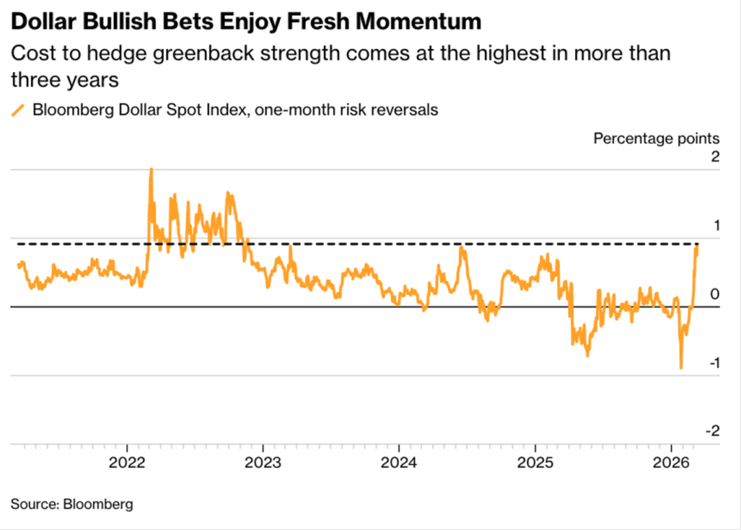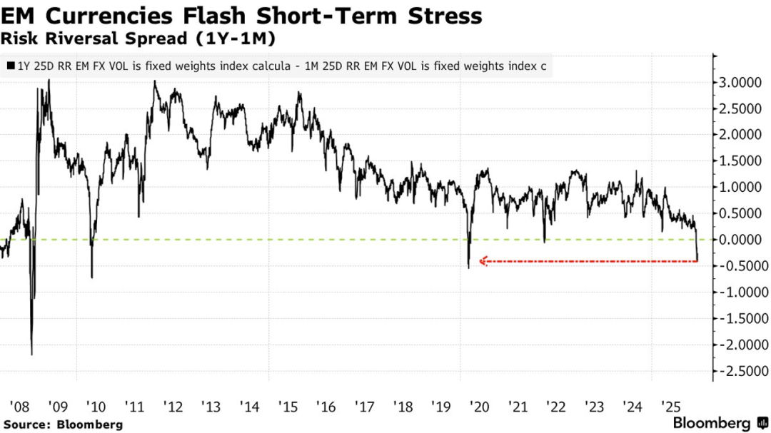 7、因担忧伊朗冲突长期化将推高油价,交易员正以疫情初期以来最快的速度购买新兴市场货币的下行保护。摩根大通新兴市场货币指数的一个月期风险逆转率,已罕见地高于一年期的风险逆转率。这种短期对冲成本超过长期的倒挂现象,已使二者价差扩至2020年以来最阔。