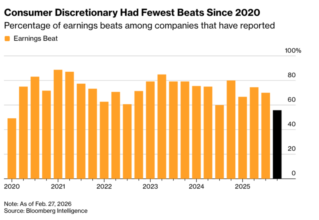 7、标普500指数非必需消费品行业中,仅有56%的公司第四季度每股收益超出市场预期,为2020年第一季度以来的最低水平,显著低于标普500指数整体73%的超预期比例。大型非必需消费品企业普遍面临高企的固定成本、消费者需求疲软以及持续高位的商品价格,这些因素共同对盈利构成压力。企业在前期已通过裁员和降低运输成本等措施削减了部分开支,进一步提升利润空间变得更加困难。