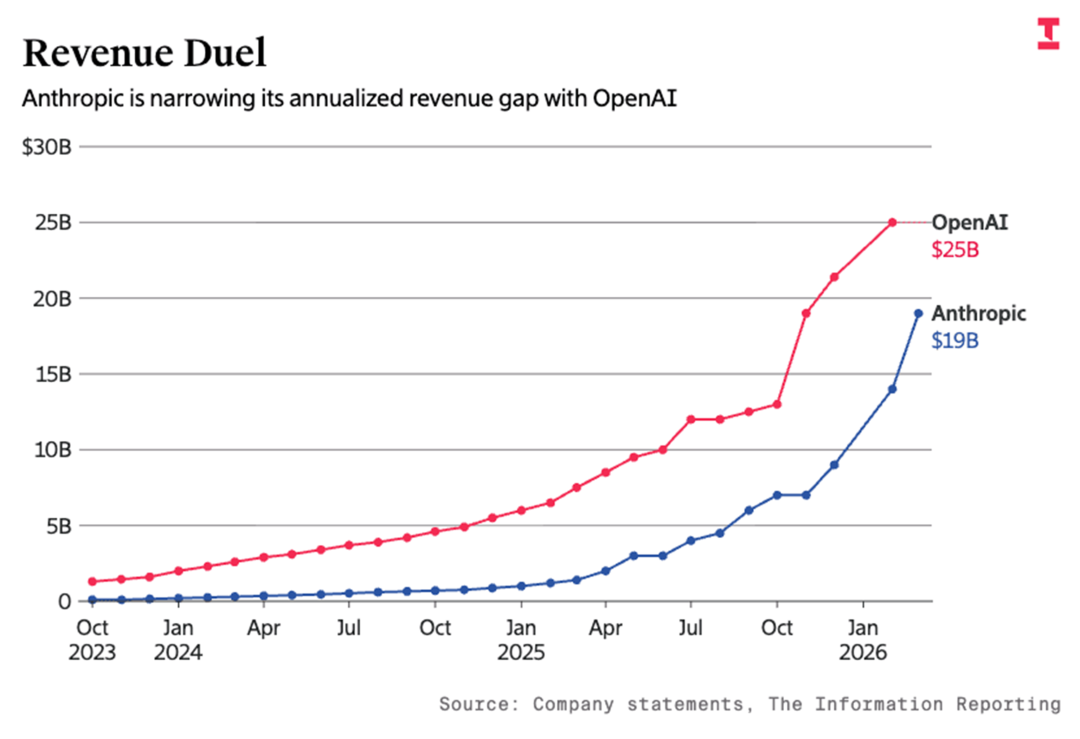 16、2026年2月,Anthropic的年化收入已突破190亿美元,与2025年底相比增长近三倍,并在过去两周内实现了36%的增幅。作为市场领先者的OpenAI,其年化收入则达到250亿美元,较2025年底的214亿美元增长17%。