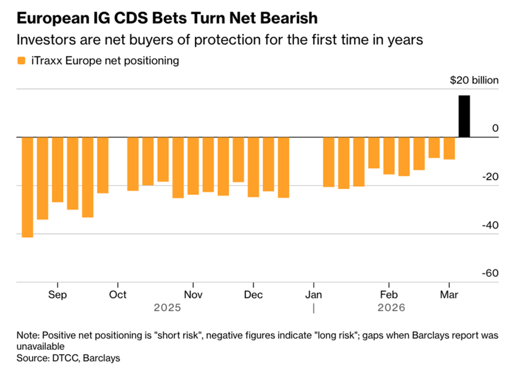 1、根据巴克莱银行汇编的DTCC数据,欧洲投资级信贷市场情绪已转为至少三年来最悲观的水平,上周作为违约保护工具的iTraxx Europe指数合约净买入额已达170亿美元,逆转了2024年5月以来投资者持续净卖出合约进行看涨押注的长期趋势。相比之下,北美CDX IG指数的仓位虽仍维持在1330亿美元的净看涨水平,但也已从1月高点回落15%。