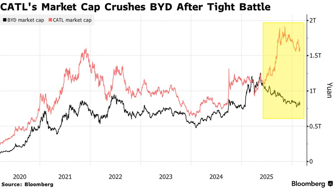 12、受益于电网项目及人工智能数据中心带来的强劲储能系统订单,电池制造商宁德时代估计去年第四季度销售额同比增长32%。与此同时,电动汽车制造商比亚迪则因中国市场竞争加剧和消费疲软,估计将录得五年来最差的季度销售表现。自2025年中期开始,两者市值出现显著分化,宁德时代目前已领先比亚迪近1200亿美元,反映出投资者情绪正从下游整车厂转向盈利前景更佳的上游电池供应商。