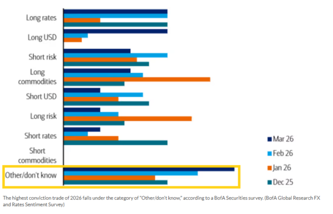 22、由于投资者不确定中东冲突还将持续多久,在美银全球研究的外汇与利率情绪调查中,当被问及“2026年最具信心的交易”时,最常见的回答是“其他/不知道”。