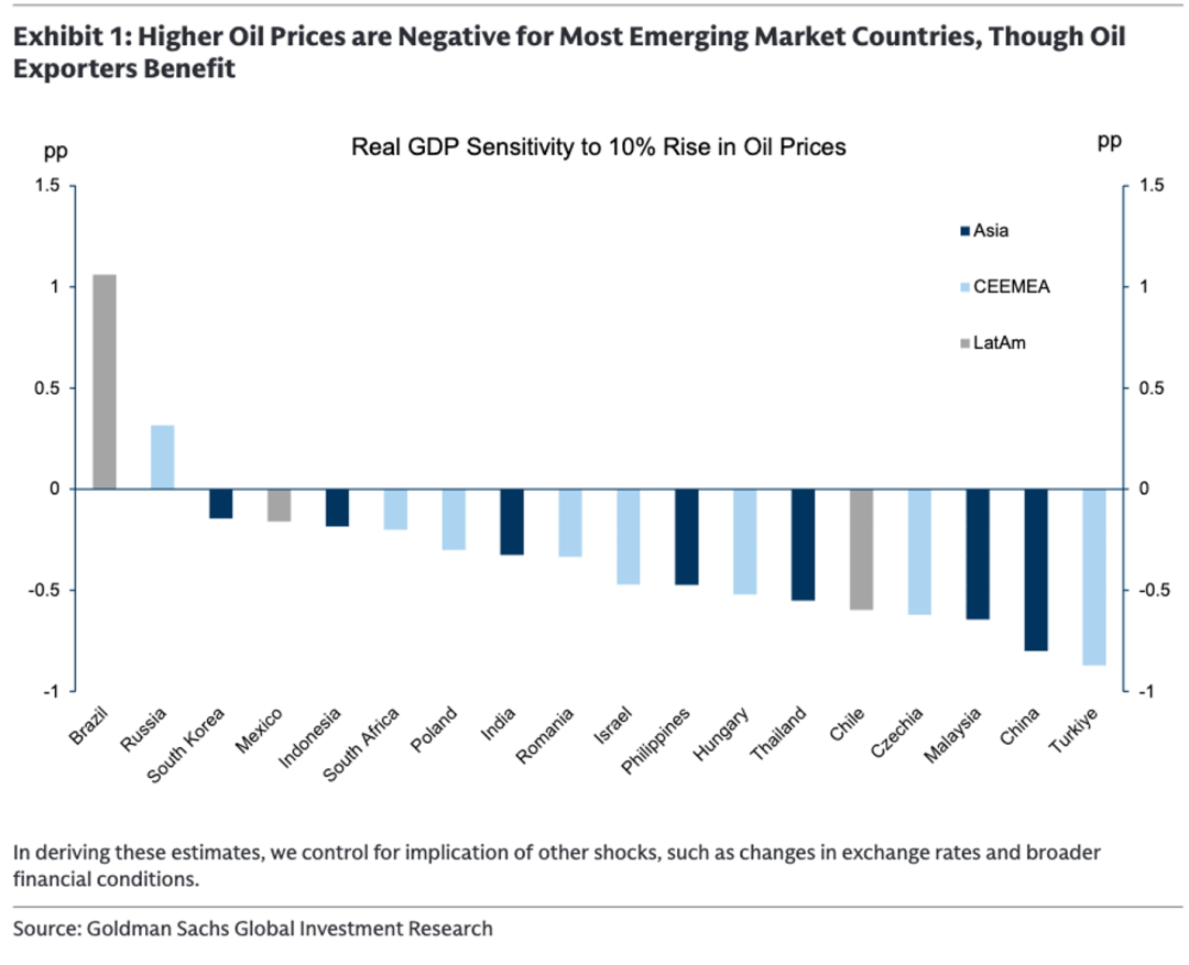 3、据高盛的测算,对俄罗斯、巴西等主要石油出口国而言,油价每上涨10%,其未来2至3年内的实际GDP水平预计将提升0.5至1.0个百分点,且多数增长效应会在冲击发生后约两个季度显现。然而,对于中国、土耳其等主要石油进口国,油价同等幅度的上涨将导致实际GDP平均下降0.3至0.4个百分点。总体来看,新兴市场经济体因油价上涨而普遍承受负面影响,这主要是因为虽然部分国家依赖商品出口,但它们自身的能源消费占比更高,且全球经济增长因高油价放缓的次生效应也带来额外压力。