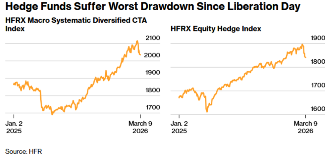 17、受伊朗战争爆发后拥挤的交易平仓潮冲击,对冲基金正经历自“解放日”关税动荡以来最严重的回撤。HFR数据显示,HFRX宏观系统化多元CTA指数在2026年3月已下跌近4%。同时,HFRX股票对冲指数也因基金在欧洲和韩国市场的多头以及在软件股的空头敞口而承压,本月跌幅达3%。此轮下跌已导致Balyasny、Citadel及Millennium等多家大型基金录得亏损。