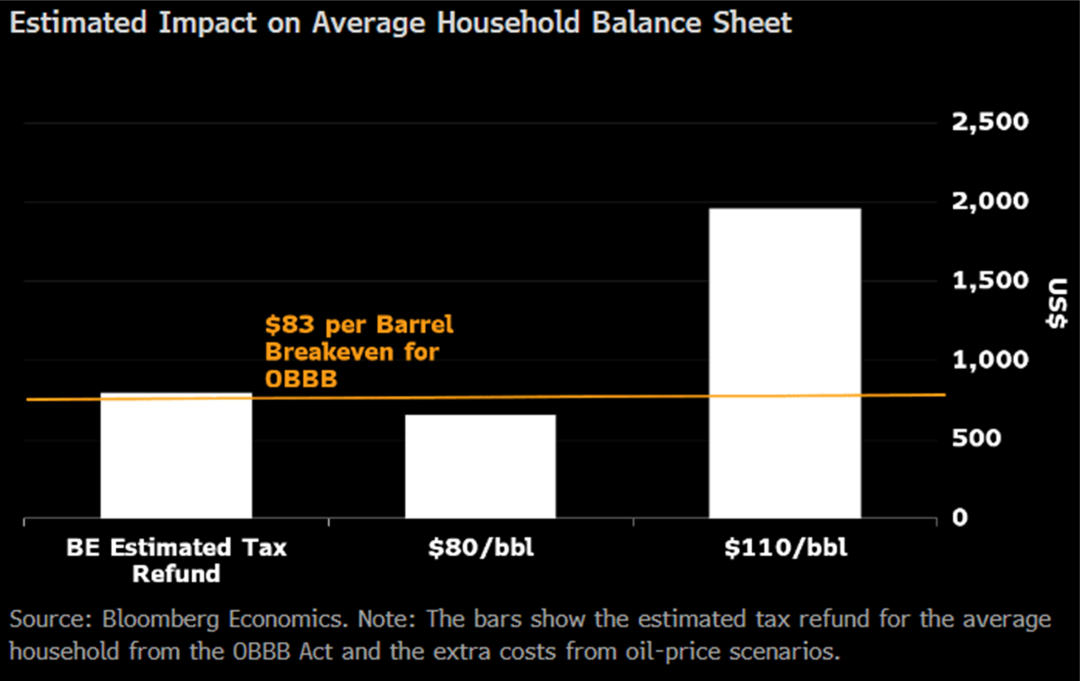 1、根据彭博经济研究,《大而美法案》中向普通家庭提供财政支持的退税政策,其效果正面临被高油价侵蚀的风险,测算显示当油价达到每桶83美元的损益平衡点时,家庭因油价上涨所承受的额外生活成本将完全抵消所获得的退税收益。
