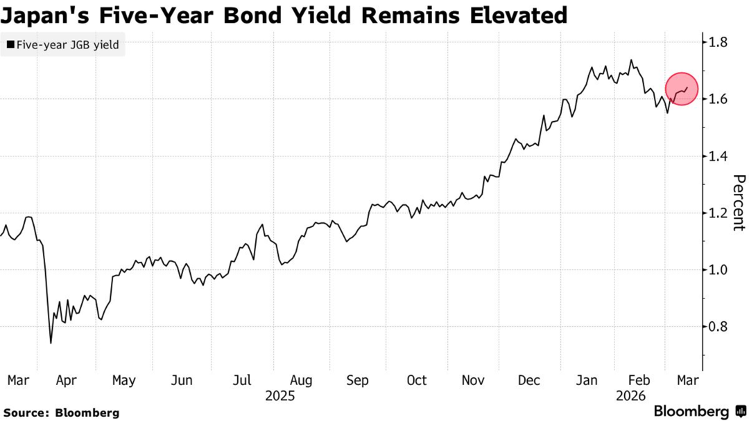 2、地缘政治风险正在影响日本央行的紧缩政策路径,在此背景下,日本最新的五年期政府债券拍卖获得了强劲需求,其投标倍数升至3.69,为2025年10月以来最高,拍卖后二级市场收益率回落至1.61%。由于油价上涨和日元走弱共同加剧了日本经济陷入滞胀的风险,市场对央行加息的预期已经降温。隔夜指数掉期显示,市场预计4月前加息的可能性已从上月底的约70%降至60%。